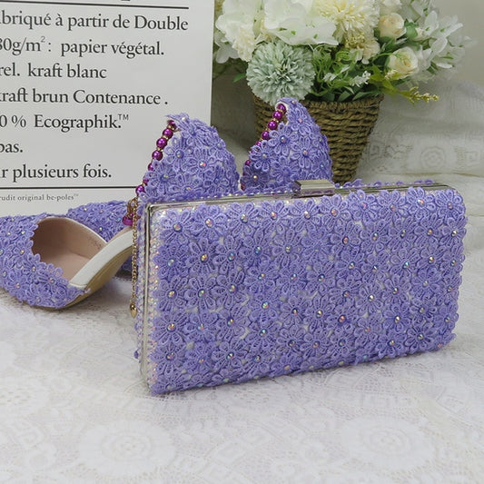 White Lace Flower wedding shoes with matching bags High heels Pointed Toe Ankle Strap Ladies Party shoe and bag set Pearl Shoe