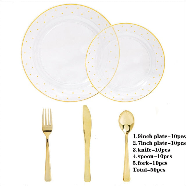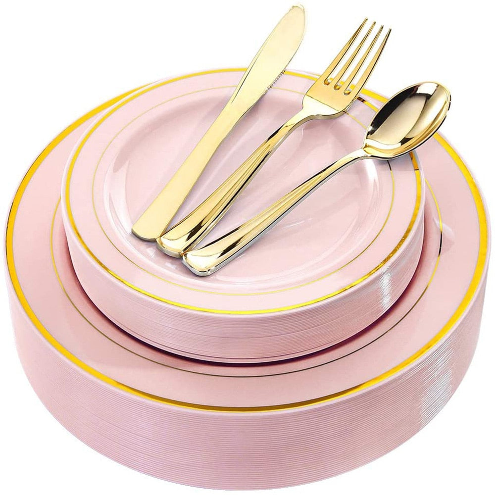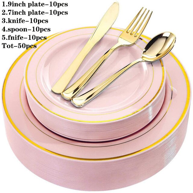 50pcs/lot Pink Plastic Plates with Gold Disposable Gold Plastic Silverware with Gold Lace Dinnerware for Wedding party Parties