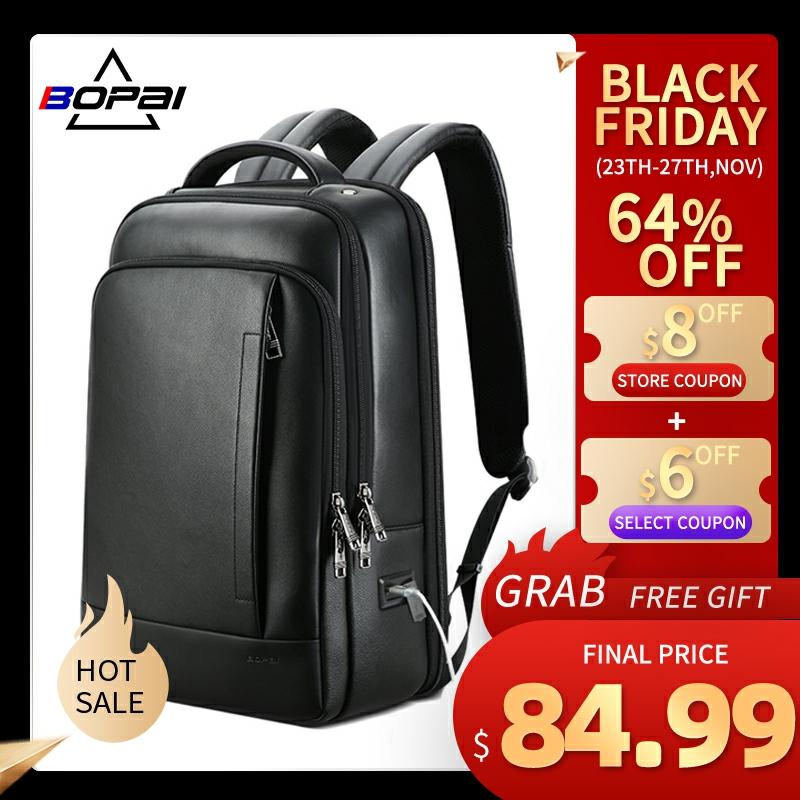BOPAI Genuine Leather Backpack Laptop Mens Business Casual Waterproof Back Pack Male Computer Bagpack Black Backpacking