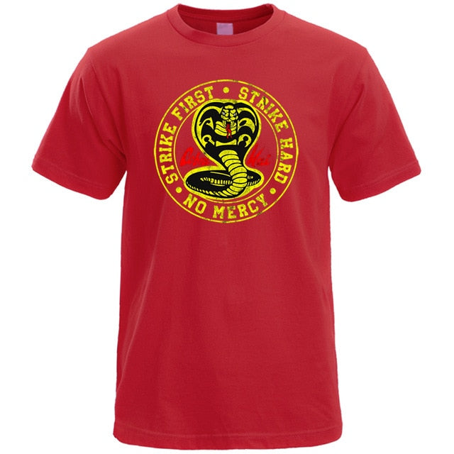 Cobra Kai T Shirt Men Strike First Strike Hard No Mercy Tshirt Shirts Cotton Summer Top Tshirts Short Sleeves Tees Black T-Shirt