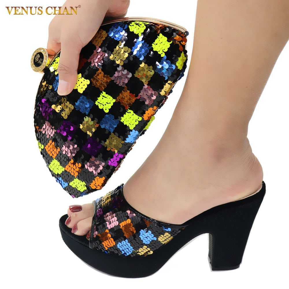 Latest African Matching Shoes and Bag in Black Color High Quality Italian with Shinning Crystal African Lady Shoes and Bag