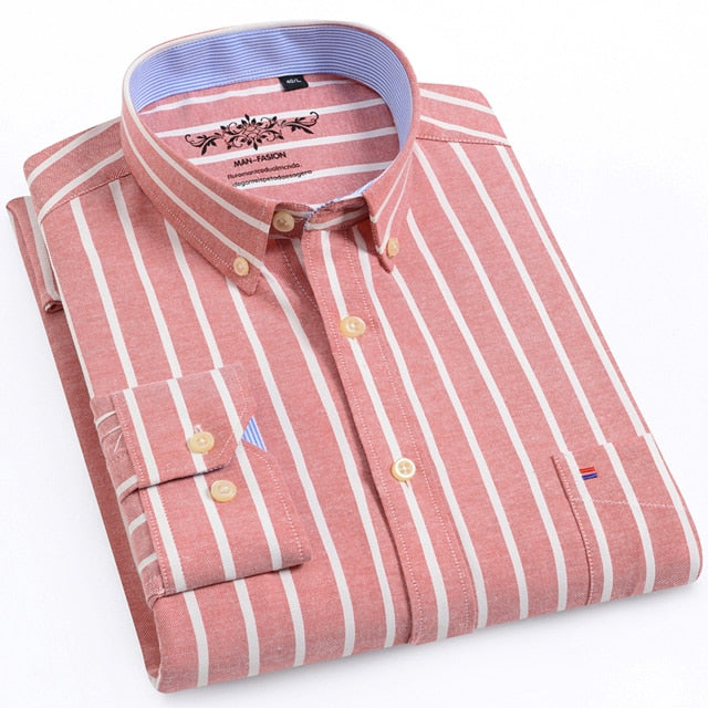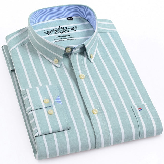 Men's Long Sleeve Oxford Plaid Striped Casual Shirt Front Patch Chest Pocket Regular-fit Button-down Collar Thick Work Shirts
