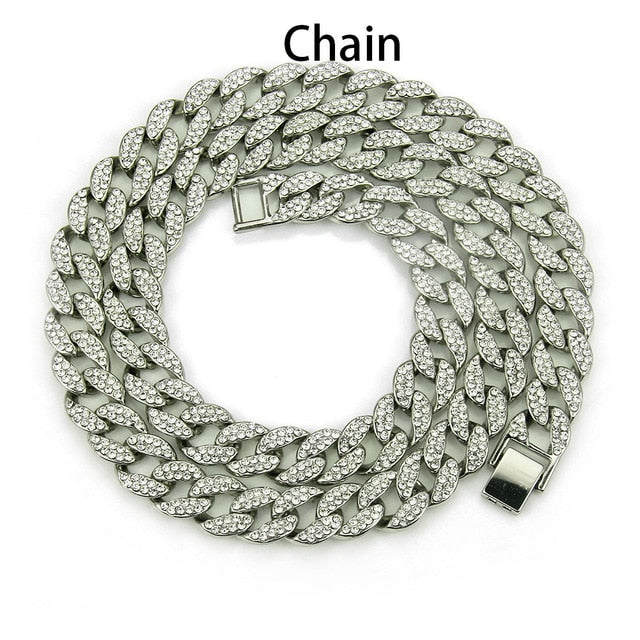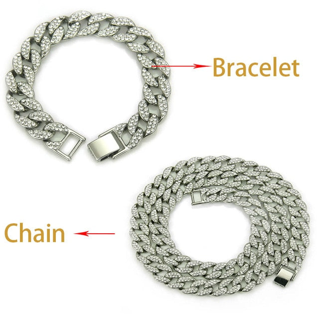Necklace+Watch+Bracelet Hip Hop Miami Curb Cuban Chain Gold Color Iced Out Paved Rhinestones CZ Bling Rapper Jewelry For Men