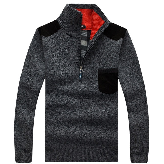 New Winter Mens Pullover Knitted Sweater Male Wool Fleece Thick Casual Pullover Patchwork Warm Pocket Sweater Standing Collar