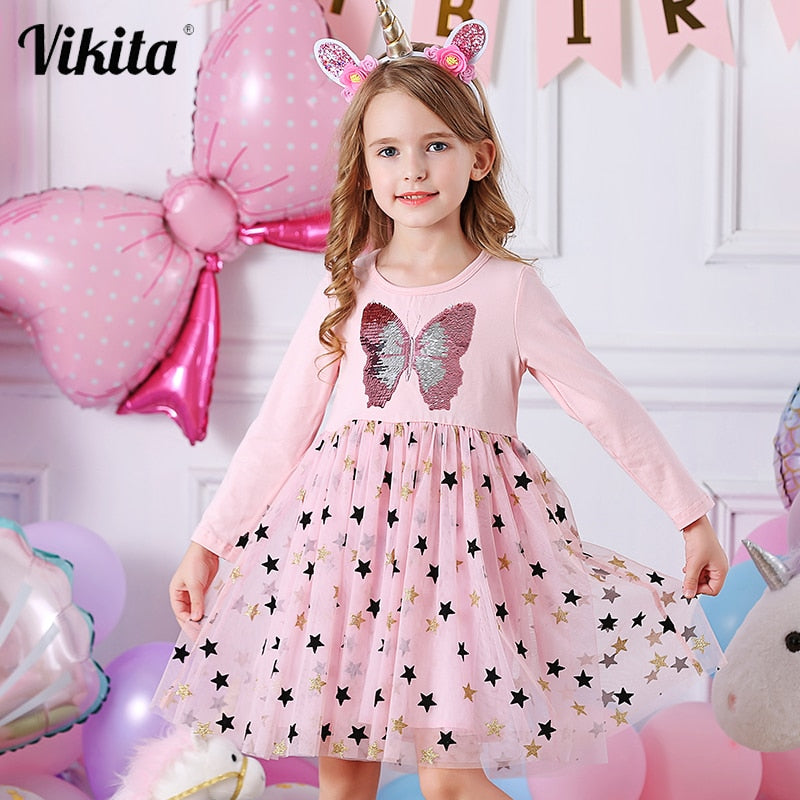 VIKITA Autumn Girls Dress Butterfly Sequins Kids Long Sleeve Dresses Baby Girls Princess Dress Party Clothes Birthday Dresses